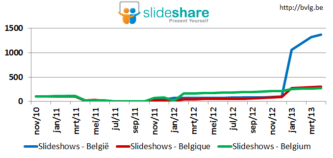 Het aantal slideshows in Slideshare dook voor het eerst op in de Belgian Social Media Monitor in november 2010. Maar Slideshare gaf een tijdje geen cijfers meer. Ondertussen zijn er terug cijfers en ze leken min of meer stabiel te zijn tot vorige maand. Sinds januari 2013 is er echter een plotse stijging. Vergelijkingen met het aantal slideshows van een jaar terug hebben bijgevolg geen zin meer.