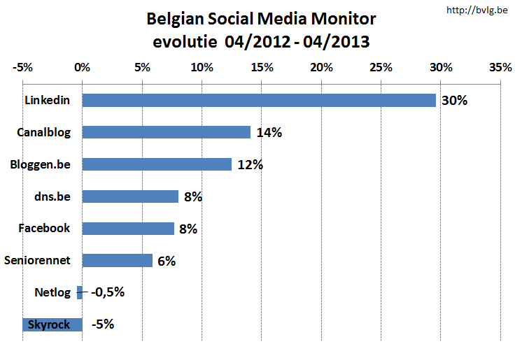 Een nieuwe maand is weer een aanleiding voor een nieuw ovezicht van de social media-cijfertjes voor België. Vanaf deze maand kan je drie nieuwe grafieken vinden. Deze geven de globale evolutie aan van WordPress.com, Tumblr en Badoo. Deze sites geven zelf geen opsplitsing per land. Het lijkt mij wel interessant de globale cijfers te volgen. De trends van de afgelopen maanden zetten zich door, wat op zichzelf natuurlijk geen verrassing is. Facebook groeit nog lichtjes met 8% op jaarbasis, de magische grens van 5 miljoen gebruikers komt zeer dichtbij. LinkedIn blijft stevig groeien, het groeipercentage daalt lichtjes de afgelopen maanden maar is nog steeds indrukwekkend (30% op jaarbasis). Sommige platformen doen het goed, zoals Seniorennet (+12%) en Canalblog (+14%), andere tonen een negatieve trend, zoals Skyrock (-5%).