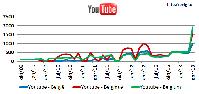 Het beeld dat YouTube geeft over de afgelopen maanden was zeer wispelturig. Deze maand is er een plotse stijging in het aantal gevonden resultaten, zonder aanwijsbare verklaring.