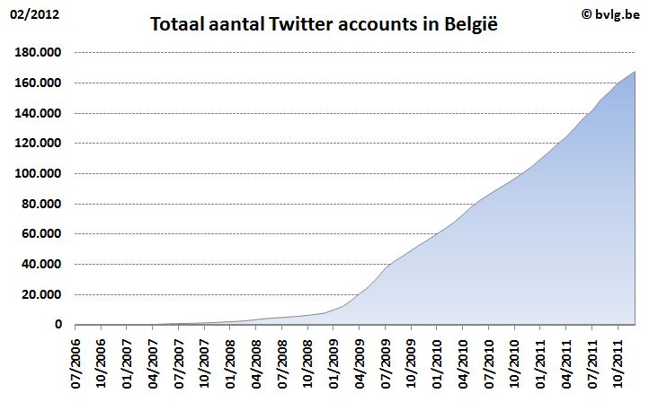 In het verleden kon je in mijn blogreeks eigen analyses van het aantal Twitter gebruikers in België terugvinden. Begin oktober 2010 kwam ik in dit bericht tot een aantal van 63.172 Twitter accounts uit België. Op de VRT Barcamp in januari 2011 heb ik een presentatie gegeven over Twitter in België. Op Slideshare kan je de slides nog bekijken, toen was er sprake van 75.000 Belgische Twitter accounts. In februari 2012 kon je in dit bericht vernemen dat ik op 31/12/2011 167.679 Twitteraccounts die aan België konden gekoppeld worden geïdentificeerd had. Ik heb hieronder nogmaals de grafiek ingevoegd die het aantal Belgische Twitteraccounts per maand aangeeft (tot 31/12/2012). Ik beschik op dit ogenblik niet over meer recente cijfers.
