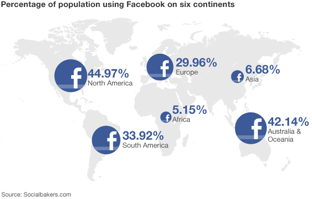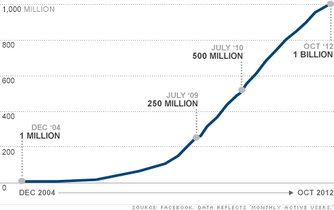 Het bezoek aan Facebook bleef redelijk gelijk. Het aantal Nederlandse account is voor het eerst boven de 7 miljoen uitgestegen en staat nu op 7,3 miljoen. Afgelopen week maakte Mark Zuckerberg bekend dat Facebook de grens van 1 miljard gebruikers is gepasseerd. Daarnaast maakte Mark nog wat indrukwekkende cijfers bekend. Sinds Facebook is gestart zijn er meer dan 1,13 biljoen likes uitgedeeld, 140,3 miljard vriendschappen gesloten, 219 miljard foto's geupload, 17 miljard met-locatie-getagte posts gepubliceerd en meer dan 62,3 miljoen nummers beluisterd (die 22 miljard keer zijn afgespeeld). De volgende twee grafieken komen van CNN (ontwikkeling maandelijks actieve gebruikers) en SocialBakers (penetratie Facebook naar geregistreerde accounts):