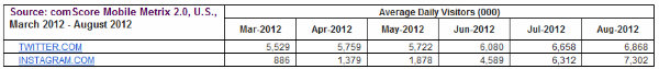 In september maakte Zuckberg bekend dat Instagram de grens van 100 miljoen gebruikers is gepasseerd. Bij de laatste update van een paar maanden geleden stond de teller nog op 80 miljoen. Uit cijfers van comScore (via) bleek diezelfde maand dat Instagram meer mobiele bezoekers heeft dan Twitter in de VS.