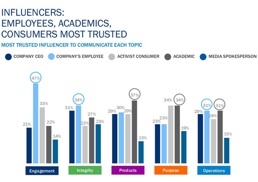 De Edelman Trust Barometer (2015), een onderzoek dat ik ook al aanhaalde in mijn vorige blog, laat zien waarom dat zo is. Medewerkers van een bedrijf genieten over de hele linie redelijk wat vertrouwen in de ogen van het publiek – veel meer dan bijvoorbeeld de persvoorlichter die traditioneel het woord voert. Dat geldt in nog sterkere mate voor technische experts in een bedrijf (niet weergegeven in onderstaande grafiek): die kunnen in 67 procent van de gevallen op vertrouwen rekenen.