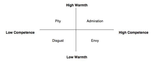 Op basis van jarenlang onderzoek kwamen Malone en Fiske tot de conclusie dat we bedrijven en merken op dezelfde eigenschappen beoordelen als mensen: warmte (heeft een merk het beste met mij voor?) en competentie (maakt een merk zijn belofte waar?). Onderstaand schema laat zien hoe dat tot verschillende waardeoordelen over een merk kan leiden.
