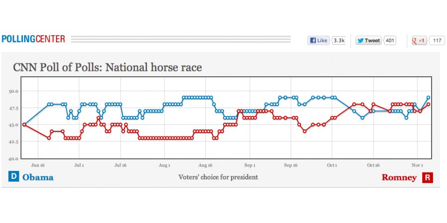 Vannacht kiest Amerika z'n president voor de komende vier jaar. Volgens de meest recente CNN-peilingen heeft Obama een voorsprong op Romney, al is die voorsprong maar klein. Tegelijkertijd geeft een aantal sites en blogs een duidelijk voordeel aan Obama, wiens winkans tussen 65% en 91% zou liggen. Maar wat zegt social media-activiteit in de afgelopen weken over de uitslag vannacht?