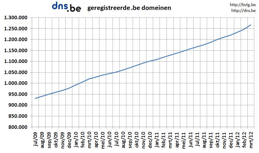 Voor april 2012 waren er 1.266.709 geregistreerde .be domeinen, een stijging van 2% ten opzichte van vorige maand, een stijging van 12% ten opzichte van vorig jaar. De cijfers van dns.be geven een zeer stabiele groei aan.
