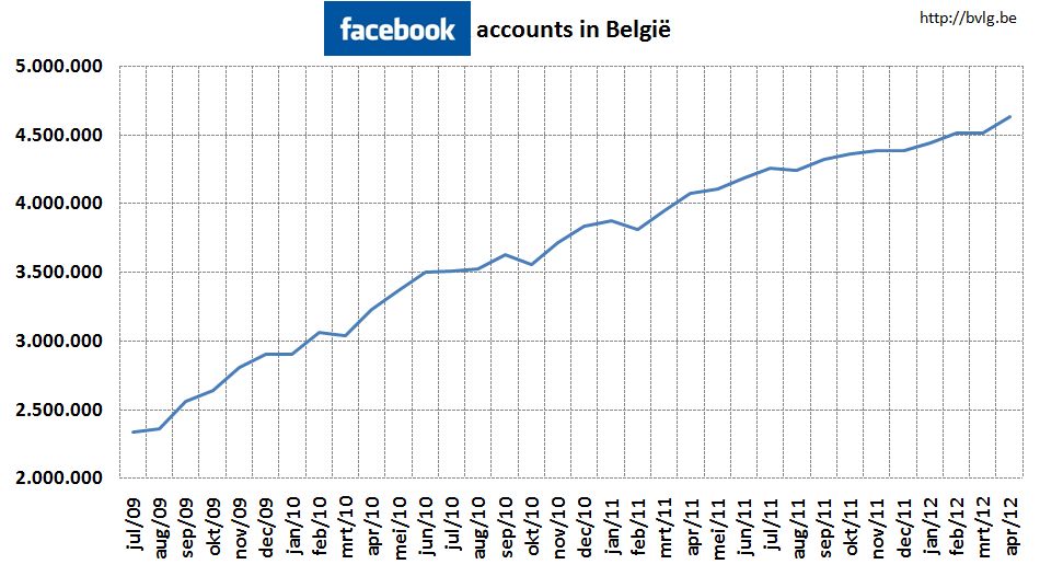 Naar analogie met de grafiek voor Netlog heb ik de evolutie van het aantal Belgische Facebook accounts over de voorbije maanden ook grafisch voorgesteld.