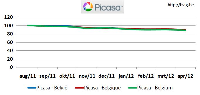 Deze cijfers geven niet het totaal aantal foto's in Picasa, enkel de foto's die publiek zijn. Het lijkt mij bizar dat er een consistente dalende trend is, wat mij enigszins bizar lijkt, er worden toch elke maand nieuwe foto's genomen.