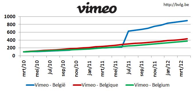 In tegenstelling met zoektocht naar video's bij Youtube is er voor Vimeo steeds een consistente opwaartse trend te zien. De zoekterm België sprong in juli 2011 terug plots bovenuit. Deze plotse stijging was duidelijk geen tijdelijke anomalie.
