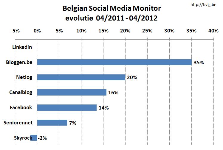 Omdat het meetpunt voor Linkedin tijdelijk geen betrouwbaar cijfer oplevert, is er in deze editie geen cijfer voor het aantal leden van Linkedin in België. Facebook blijft veruit de grootste sociale netwerksite in België, met reeds 4,6 miljoen geregistreerde accounts. De groei op jaarbasis bedraagt nog steeds 14%. De site bloggen.be kende de laatste maanden een sterke groei, op jaarbasis bedraagt die groei 35%. Andere blogplatformen stijgen veel minder of dalen zelfs lichtjes. Voor het eerst sinds de start van de metingen laat Netlog een netto daling zien. Netlog zegt zelf nog steeds over 4 miljoen Nederlandstalige leden te beschikken, maar over de activiteitsgraad van deze leden is er helemaal geen info. Door een plotse opstoot in november 2011 is er nog steeds sprake van een onrealistische groei van 20% op jaarbasis.