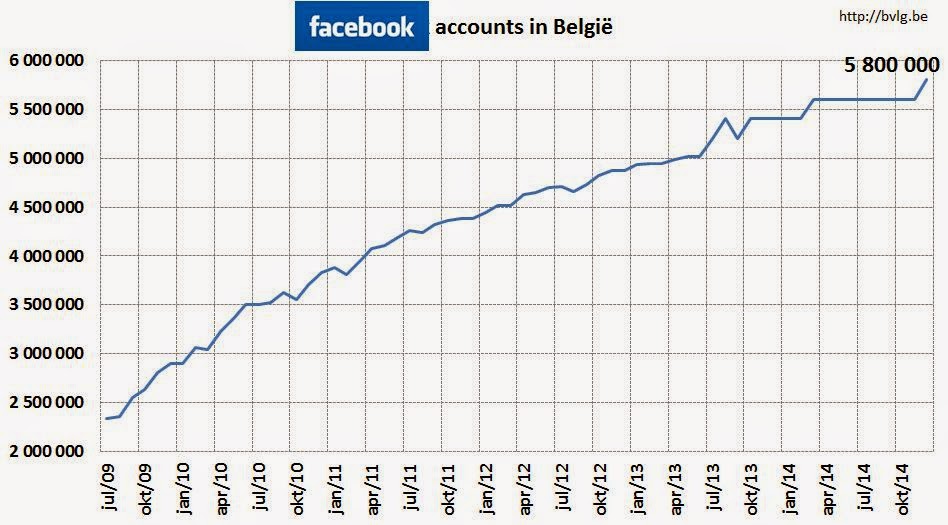 • Facebook: ‘5.800.000 people who live in Belgium’, een stijging van 4 procent ten opzichte van vorige maand, een stijging van 7 procent ten opzichte van vorig jaar.