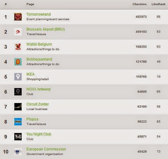 LikeAlyzer is een bron waar je het aantal Facebook-checkins voor een land kan nagaan. In België blijkt Tomorrowland nog steeds de meest populaire checkin-locatie te zijn met 492.973 checkins.