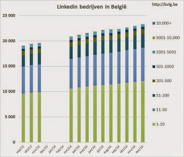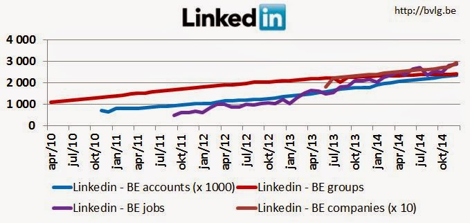 • LinkedIn groups: ‘2.405 groups refering to Belgium’, status quo ten opzichte van vorige maand, een stijging van 4 procent ten opzichte van vorig jaar