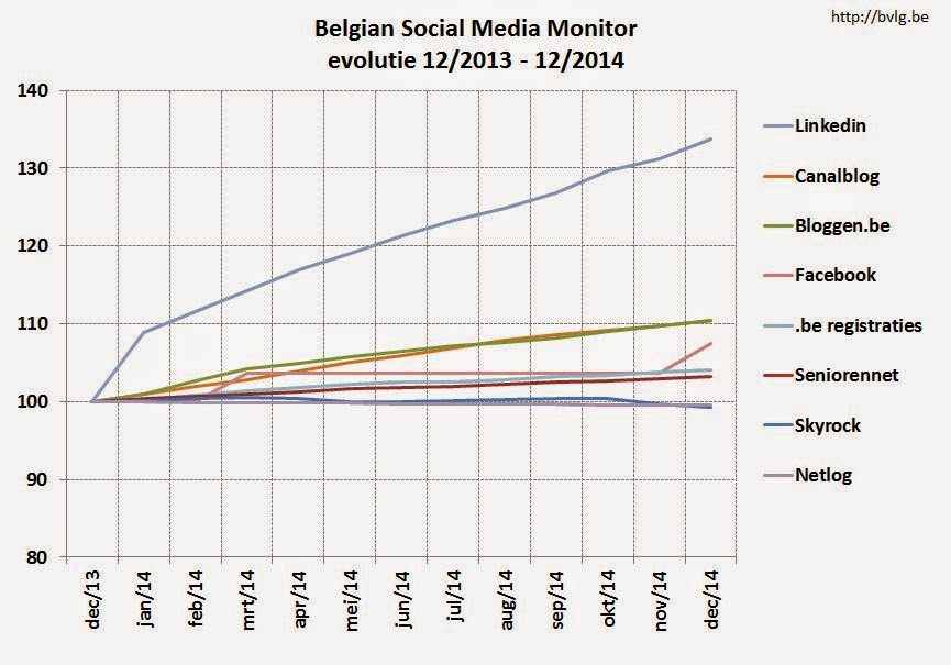 De basis van dit maandelijks overzicht van publiek beschikbare cijfers over de omvang van het socialmediagebeuren in België werd gelegd in juli 2009. De situatie van begin december 2014 wordt voor zover mogelijk vergeleken met de situatie van vorige maand (november 2014) en van vorig jaar (december 2013).