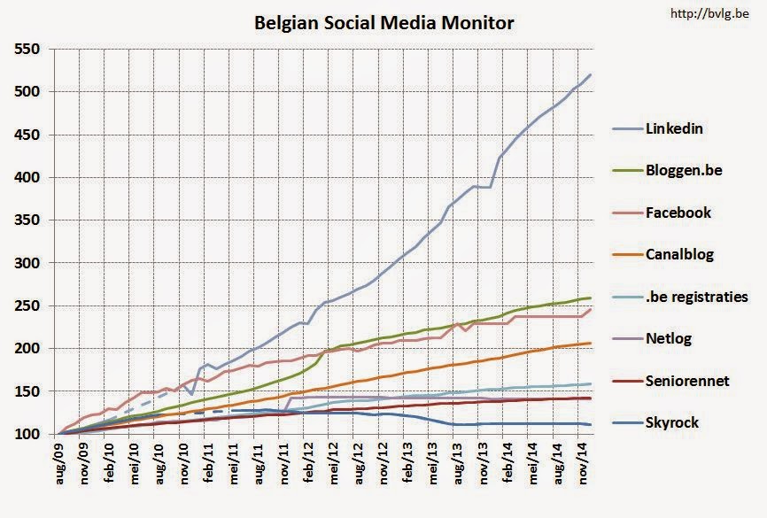 Al meer dan vijf jaar maak ik maandelijks een overzicht van de stand van zaken van de social media, met de nadruk op cijfers voor België. In het begin was het overzicht beperkt (11 indicatoren), maar inmiddels is het uitgegroeid tot een uitgebreide verzameling indicatoren (misschien zelfs teveel) met een heleboel grafiekjes om de evolutie van de socialenetwerksites in België te illustreren.