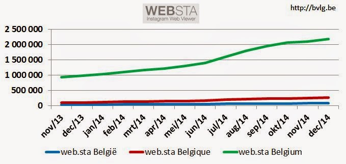 Via websta.me kun je nagaan hoevaak een zoekterm gebruikt wordt als tag van Instagram-foto’s. De evolutie van het de tags #belgie, #belgique, #belgium geeft een idee van de populariteit van Instagram in België.