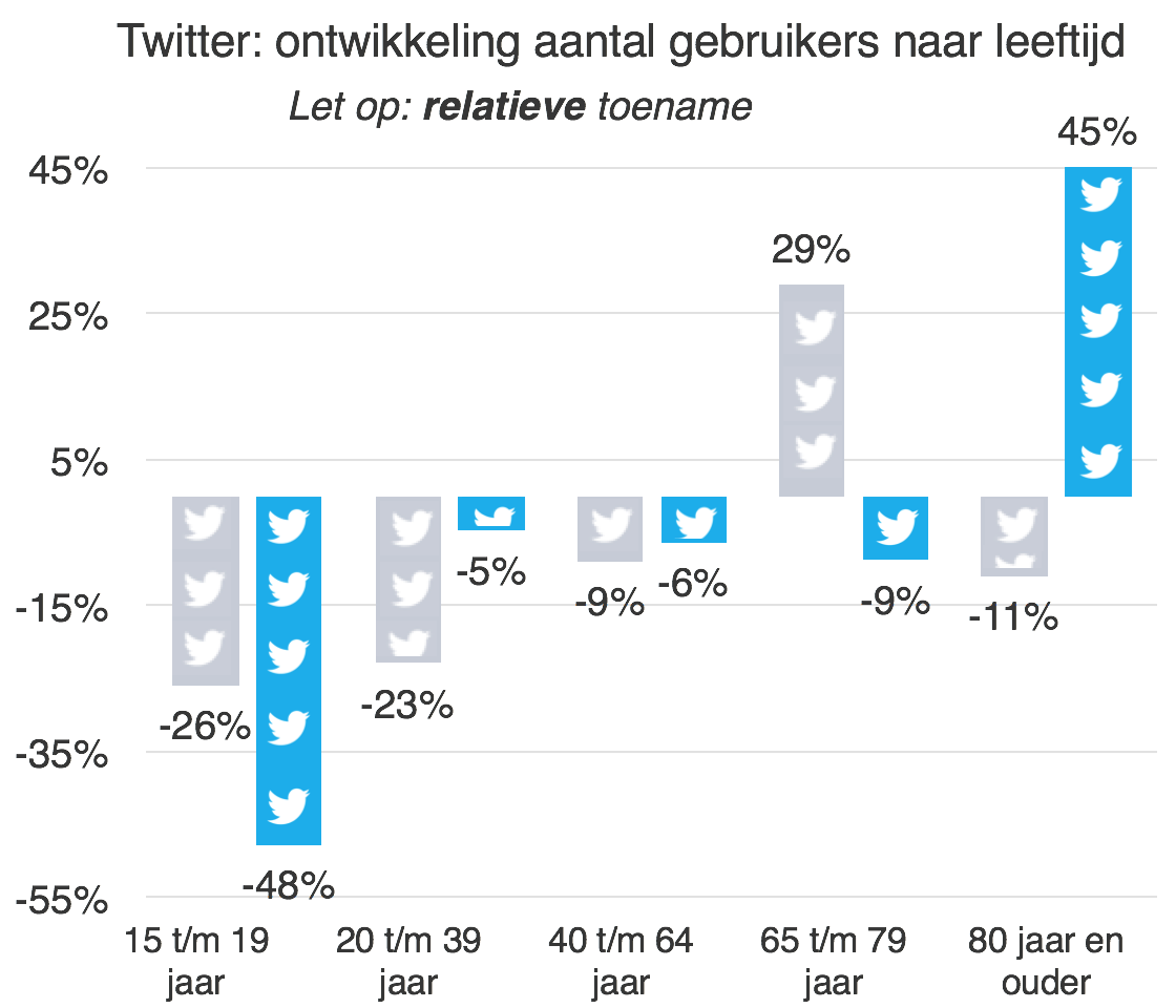 Het gebruik van Twitter neemt onder vrijwel alle leeftijdsgroepen af. Net als vorig jaar daalt het twittergebruik het sterkst onder jongeren. De belangrijkste reden waarom mensen afhaken is dat het hen te weinig oplevert (35 procent) of dat het hen teveel tijd kost (28 procent).