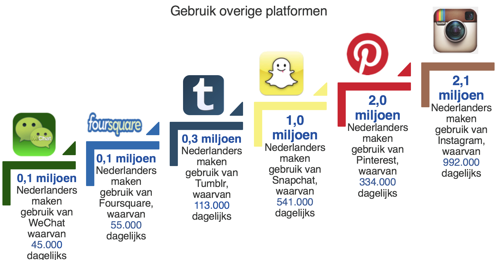 Zoals vorig jaar al de verwachting was, heeft Instagram in 2016 met 992.000 dagelijkse gebruikers Twitter gepasseerd (864.000 dagelijkse gebruikers).