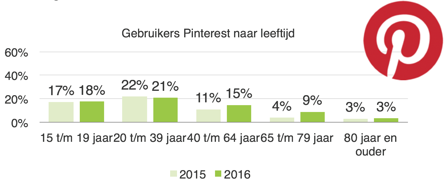 Ook het gebruik van Pinterest is in 2016 sterk gegroeid ten opzichte van 2015. Er zijn 2 miljoen Nederlanders die ‘pinnen’, 0,4 miljoen meer dan in 2015. De doelgroep van Pinterest is duidelijk meer volwassen dan die van Instagram en Snapchat. Behalve door jongeren wordt het ook veel door 20- tot 39-jarigen gebruikt, evenals door 40- tot 64-jarigen.