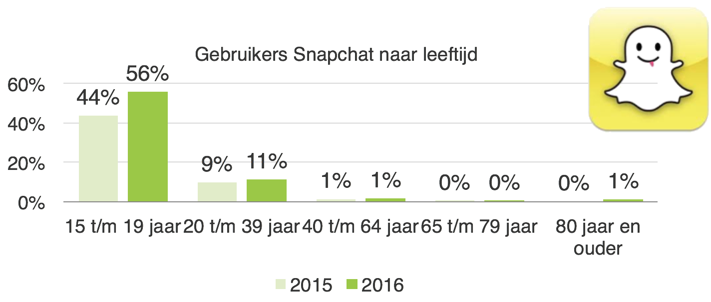 Snapchat is van de jongeren. Meer dan de helft (56 procent) van de jongeren ‘snapt’ er op los. Van de 40-plussers gebruikt nog geen 1 procent de app. Het aantal gebruikers van Snapchat groeide van 0,8 miljoen in 2016 naar 1 miljoen in 2016.