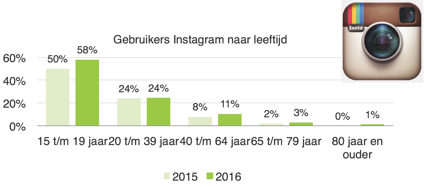 Het gebruik van Instagram, Pinterest en de kleinere platformen zet in 2016 verder door. Instagram is niet meer weg te denken: 2,1 miljoen Nederlanders gebruiken de app, 0,3 miljoen meer dan in 2015. De app is vooral populair onder jongeren en 20- tot 39-jarigen.