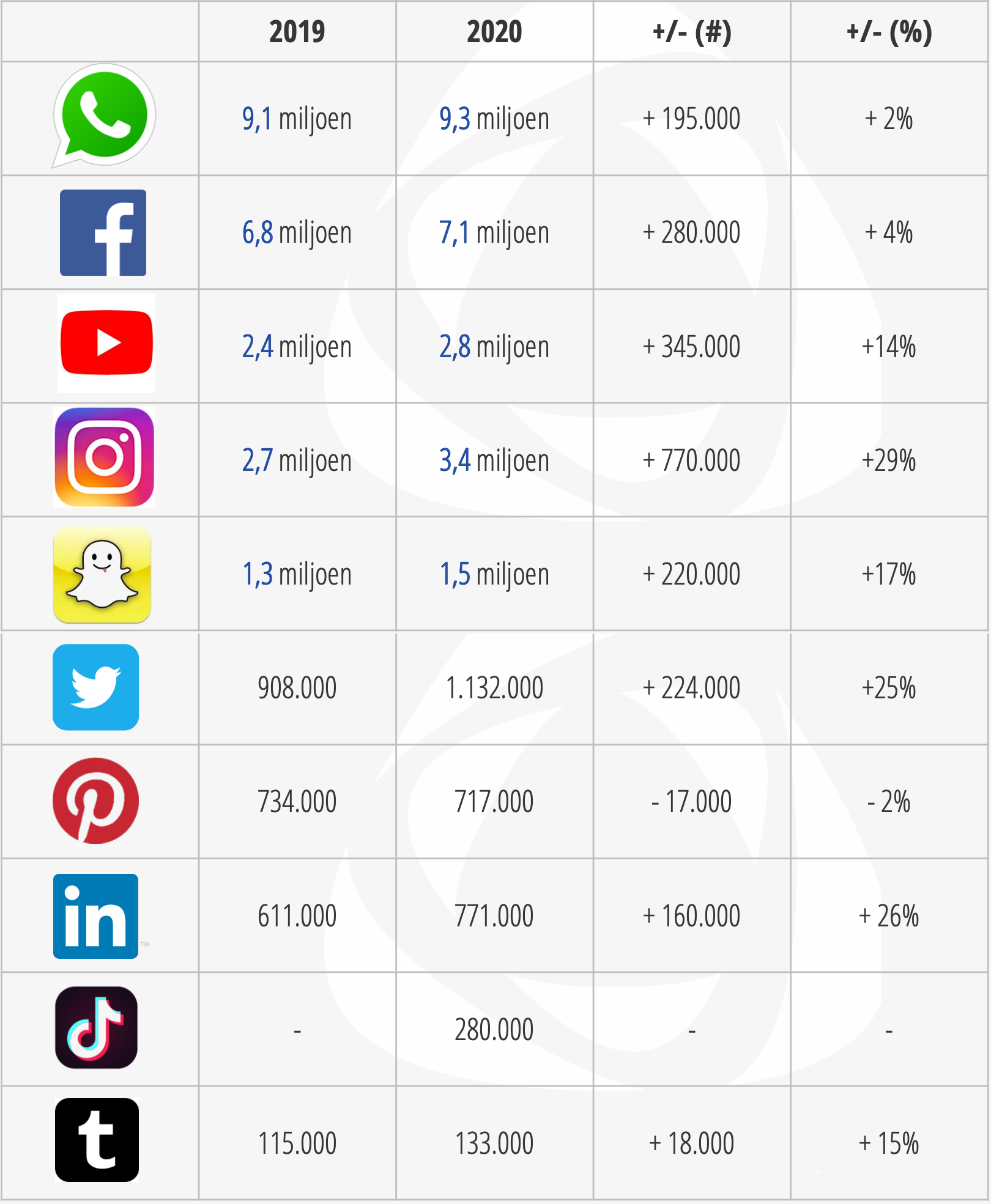 Bij Twitter is de verhouding minder scheef, ruim één op de drie gebruikers komt dagelijks op Twitter. Het zijn er dit jaar om precies te zijn 1.132.000, en dat betekent een flinke groei van 25 procent (ofwel 224.000 gebruikers) ten opzichte van 2019.