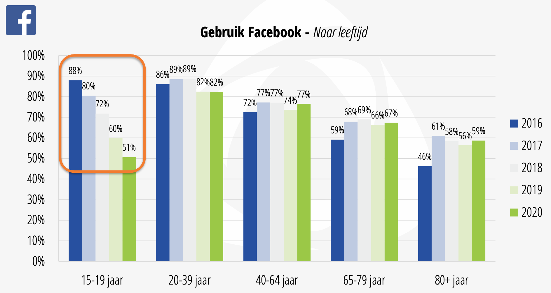 In een jaar zonder grote schandalen weet Facebook lichtjes te groeien in gebruikers. Dit jaar maken 10,4 miljoen Nederlanders gebruik van Facebook, dat zijn er 230.000 meer dan in 2019 (+2 procent). Onder de meeste leeftijdsgroepen is sprake van marginale groei of stabiliteit. Onder jongeren blijft het gebruik wel afnemen. In de afgelopen jaren daalde het Facebookgebruik onder jongeren van 88 procent in 2016 naar 51 procent in 2020.