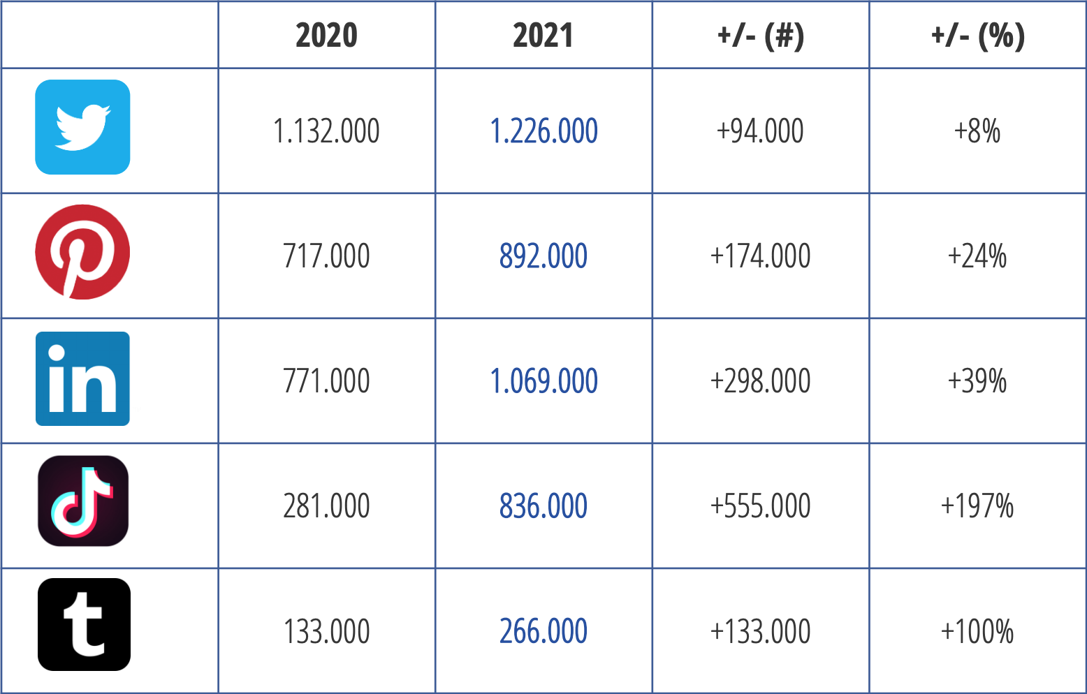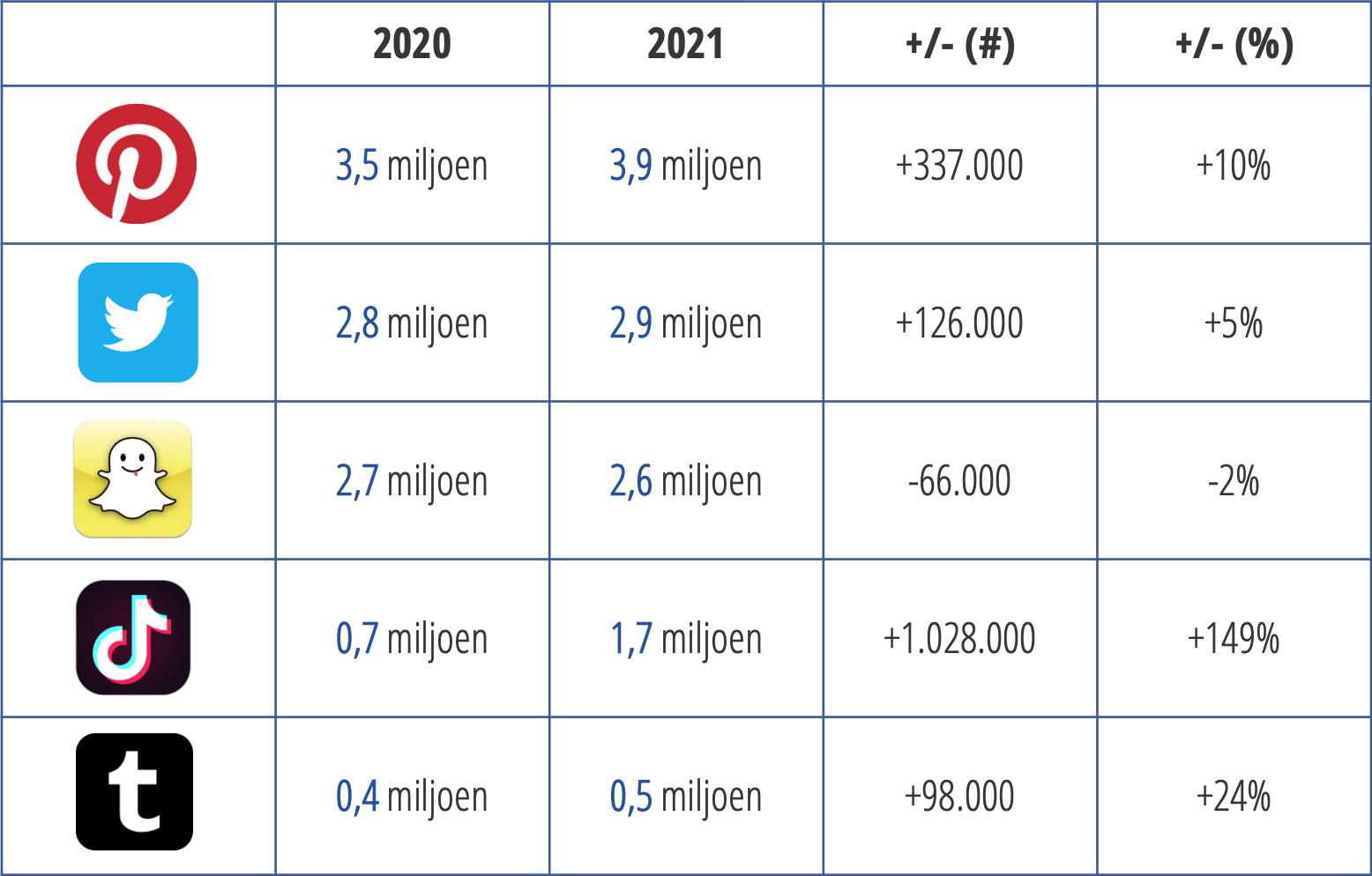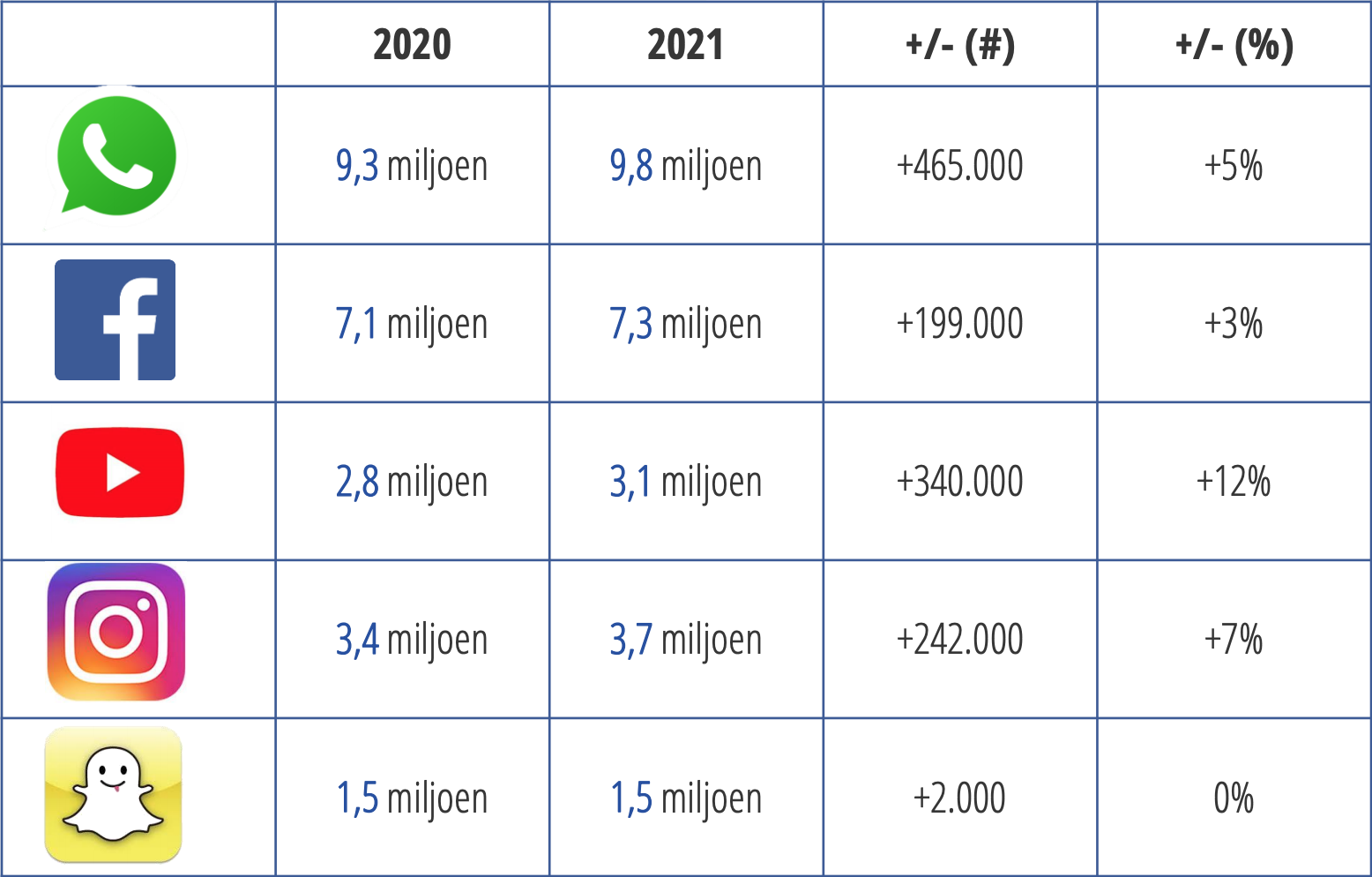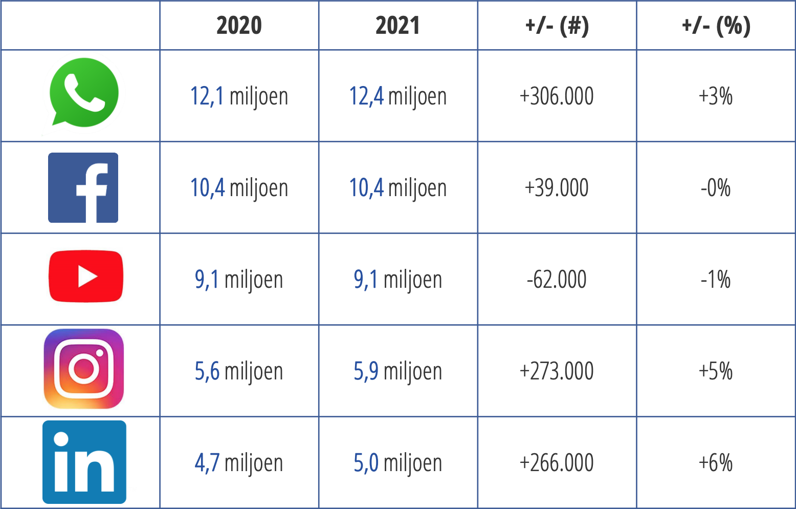 De grote platforms blijven stabiel of groeien heel lichtjes. WhatsApp lijkt in de cijfers geen last te hebben van de recente ophef over het verplicht datadelen met Facebook (dit gold niet voor Europese gebruikers, maar zorgde toch voor veel ophef). Het aantal WhatsApp-gebruikers groeide licht met 3 procent. Procentueel gezien groeien Instagram en LinkedIn van de grotere platforms het hardst. Het gebruik van Facebook en YouTube is gelijk aan dat van vorig jaar.