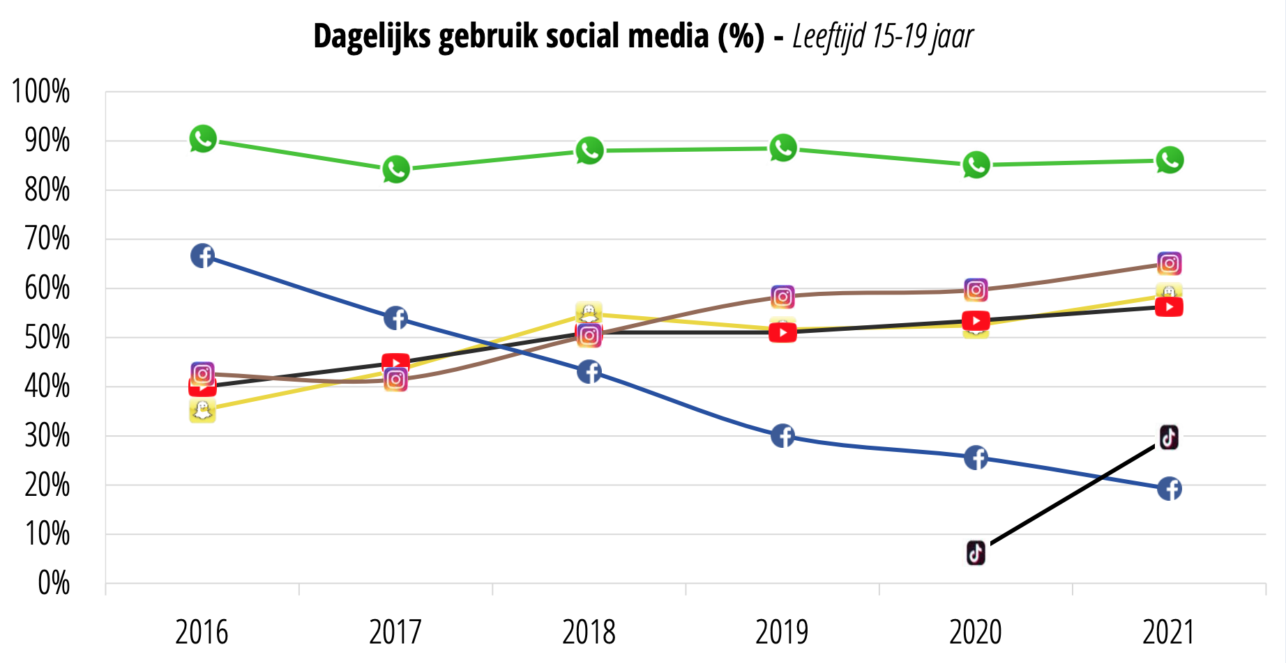 Als we kijken naar het social-mediagebruik onder jongeren, dan bungelt Facebook inmiddels onderaan de grafiek. Waar WhatsApp, Snapchat, Instagram en YouTube in dagelijks gebruik al ver boven Facebook stonden, is dankzij een enorme stijging ook TikTok het Amerikaanse sociale netwerk van Mark Zuckerberg gepasseerd.