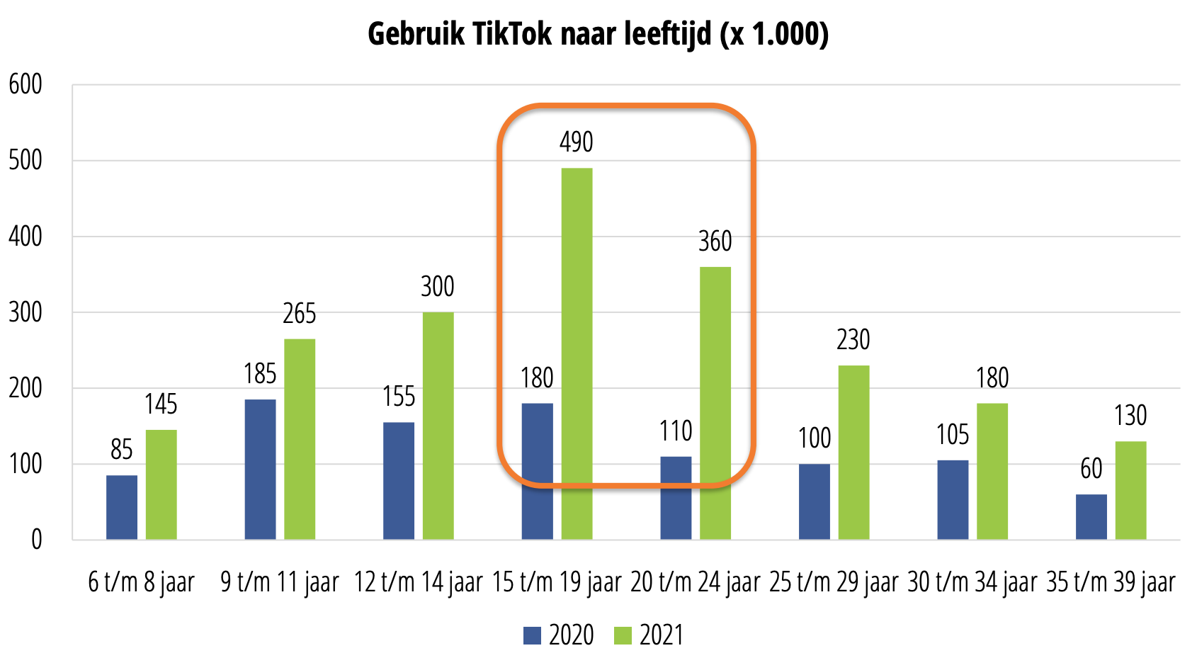 TikTok is inmiddels dus niet meer alleen de plek voor scholieren. Naast het gebruik onder jongeren, neemt ook het gebruik in de leeftijdsgroep 20 t/m 24 jaar flink toe.
