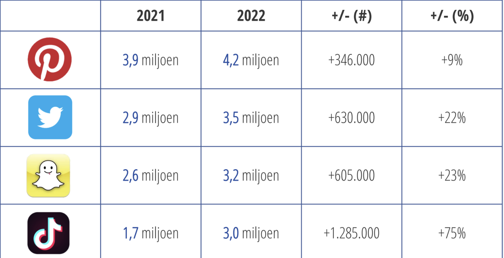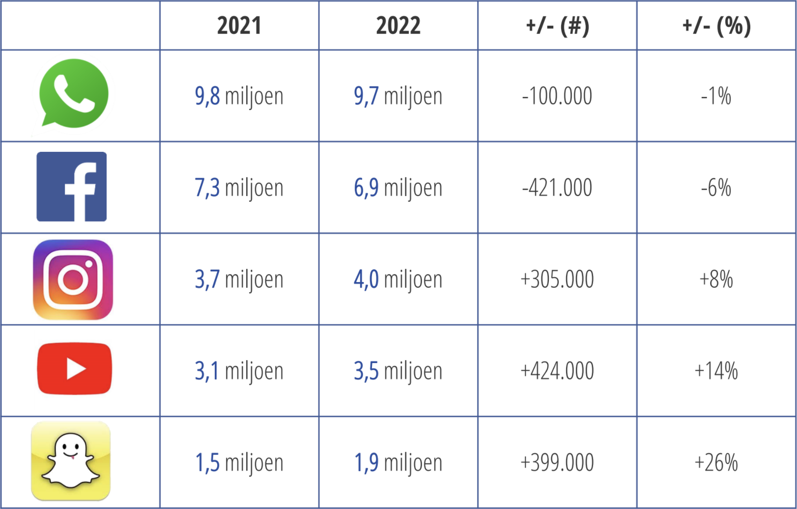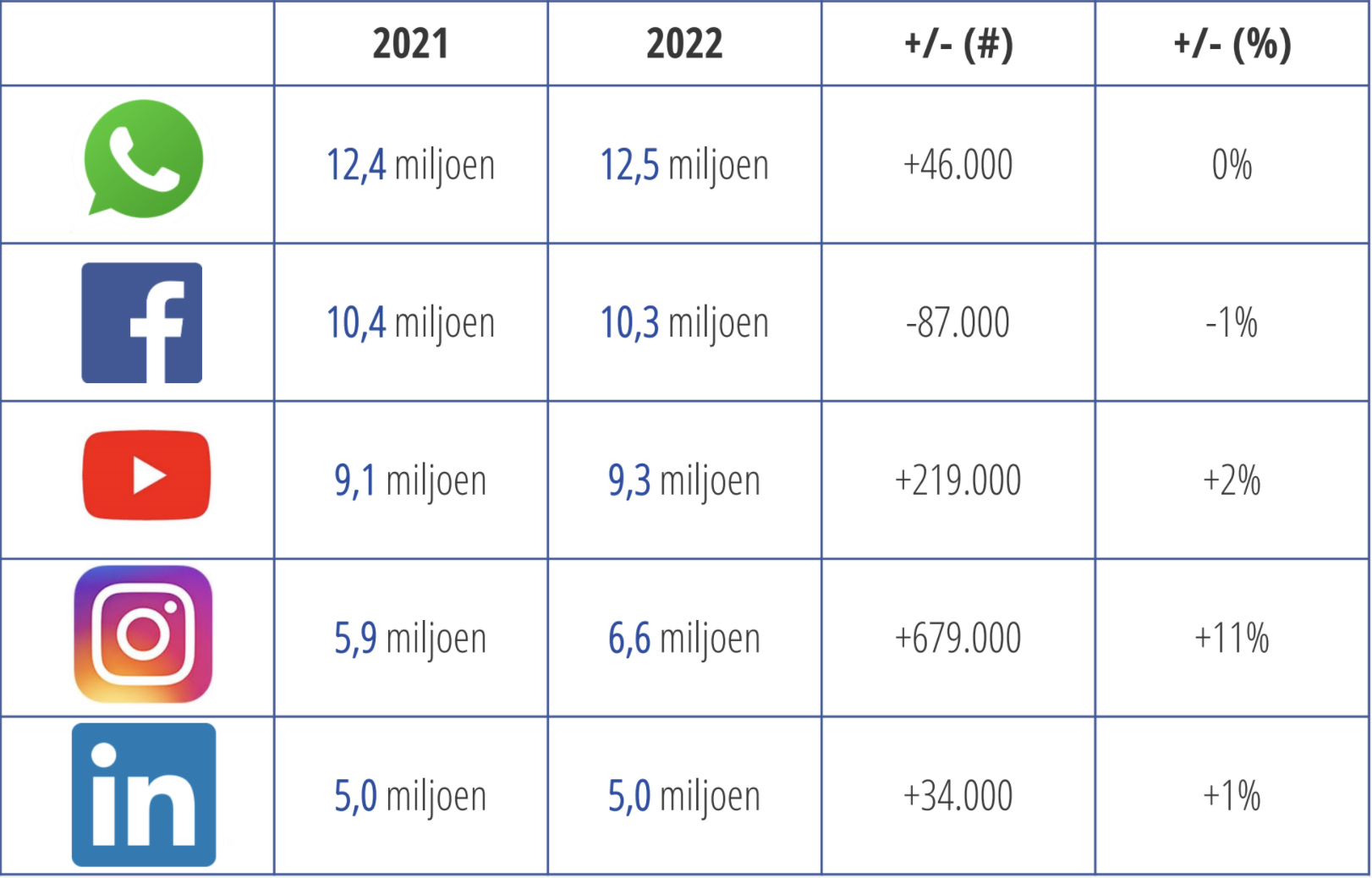 Onder de grootste social media platforms is er weinig beweging te zien in het gebruik. WhatsApp en Facebook blijven in totaal gebruik vrijwel gelijk. WhatsApp groeide van 12,4 naar 12,5 miljoen gebruikers, en Facebook daalde licht van 10,4 naar 10,3 miljoen gebruikers. Bij LinkedIn bewoog de teller niet ten opzichte van vorig jaar.