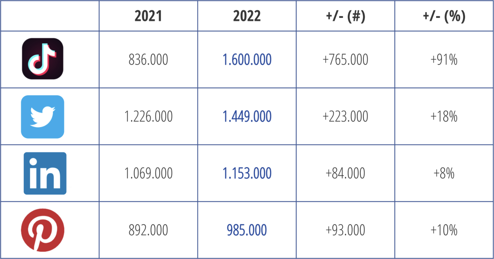 TikTok is de grootste stijger op de lijst van het gebruik van social media platforms in Nederland. Net als vorig jaar, toen het aantal TikTok-gebruikers verdubbelde. Het afgelopen jaar groeide het aantal gebruikers van 1,7 miljoen naar 3 miljoen. Ondanks gedoe over privacy boekt het platform dus een groei van maar liefst 75 procent. Het dagelijks gebruik verdubbelde bijna, van 836.000 naar 1,6 miljoen Nederlanders (+91 procent).