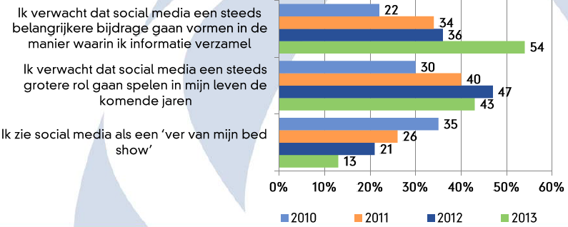 Het gebruik van social media is inmiddels geïntegreerd in het leven van de Nederlander. Men verwacht met toenemende mate dat social media een belangrijke bron zijn voor het verzamelen van informatie (2010 – 22 procent, 2013 – 54 procent). Daarnaast ziet men social media steeds minder als een ‘ver van mijn bed show’ (2010 – 35 procent, 2013 – 13 procent). Er is in vergelijking met voorgaande jaren voor het eerst een daling te zien in de verwachting dat social media een steeds belangrijkere rol gaan spelen in het leven. Dit bevestigt dat social media in 2013 inmiddels vanzelfsprekend zijn.