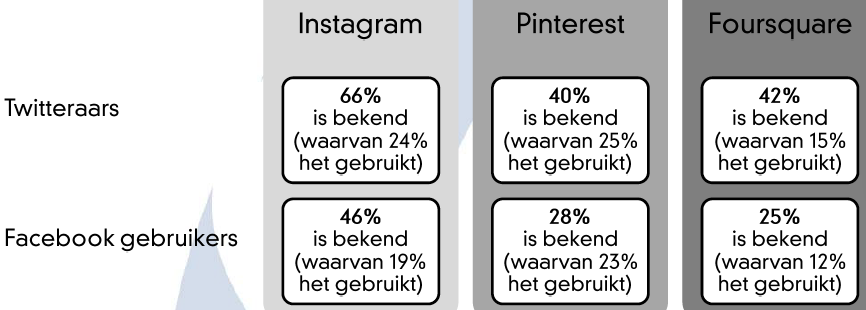 Door wat meer in te zoomen op het social media gebruik van Twitteraars en Facebookers zien we dat Twitteraars meer gebruik maken van nieuwe sociale media zoals Instagram. Het leeuwendeel van de Twitteraars (86 procent) maakt gebruik van Facebook. Zo zijn Nederlanders die Twitter gebruiken meer bekend met zowel Instagram, Pinterest en Foursquare, en maken ze er ook vaker gebruik van.