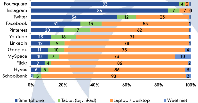 Instagram kent over de gehele linie de meeste smartphonegebruikers, wat logisch is gezien het een app betreft. Meer dan de helft (54 procent) van de Twitteraars gebruik hun smartphone, bij Facebook is dit minder dan een derde.