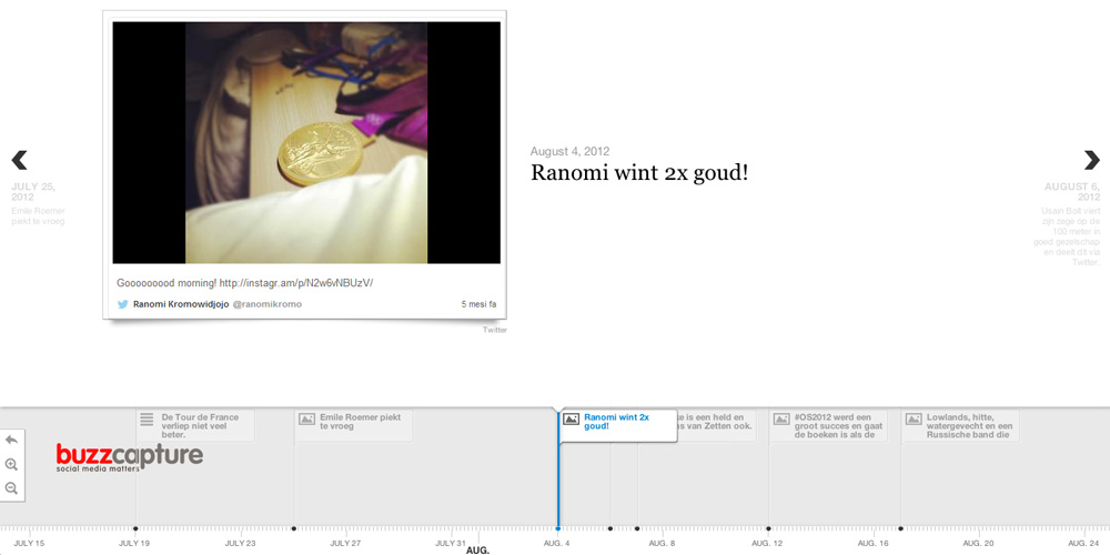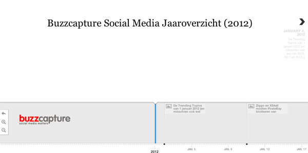 Als we kijken naar de trending topics van 1 januari 2012 blijkt iedere nieuwjaarsdag dezelfde hoogtepunten te kennen. #HappyNewYear, #Nieuwjaarsduik, #Nieuwjaarsconcert en #Schansspringen waren trending topic in Nederland. De 365 dagen daarna onderscheidde 2012 zich van andere jaren. Beleef het jaar nog een keer door de social media bril in de nieuwe vorm van onze rapportage: Timeline.