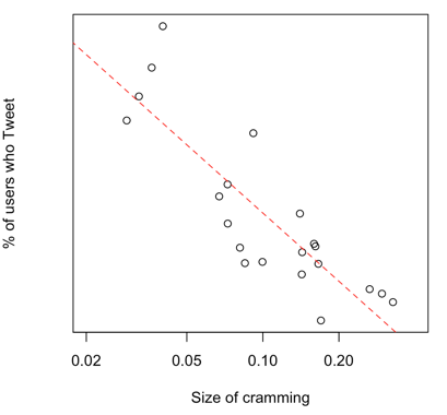 De correlatie tussen het aantal mensen dat tweet en de moeite die kost te tweeten.
