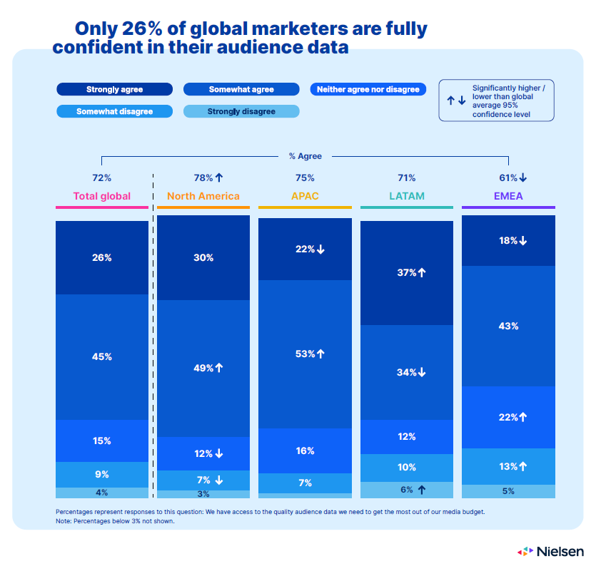 Gezien de voortdurende digitale versnippering, geven marketeers aan dat nauwkeurigheid van data, meten en ROI de belangrijkste zorgpunten zijn. Hoewel 69% van de marketeers gelooft dat data uit eerste hand essentieel zijn voor hun strategieën en campagnes en 72% van de marketeers gelooft dat ze toegang hebben tot kwalitatief hoogwaardige data, heeft slechts 26% van de wereldwijde marketeers volledig vertrouwen in de data over hun doelgroepen.
