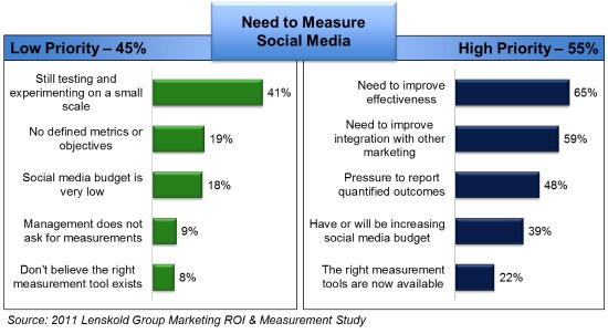 Eerst enkele cijfers uit de ‘Marketing ROI & Measurement Study’ 2011 van Jim zijn Lenskold Group. Daaruit blijkt dat de nood om sociale media te meten lager ligt bij bedrijven die nog op kleine schaal experimenteren dan bij marketeers die de efficiëntie van hun social media programma’s willen verhogen en de integratie willen verbeteren.