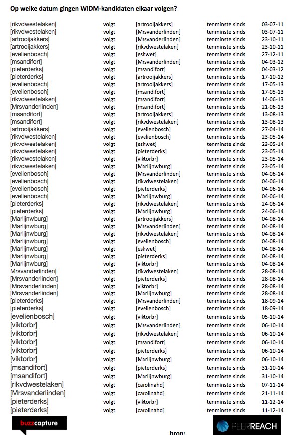 Als we naar de actuele volgrelaties kijken, dan is dit natuurlijk nadat de perspresentatie geweest en hebben alle deelnemers elkaar weer gezien in oktober. Gelukkig heeft Buzzcapture een partner die nog verder in de volgrelaties kan duiken: PeerReach. Dit Nederlandse bedrijf heeft een enorme database met volgrelaties aangelegd. Het mooie is dat zij ook op 2 weken nauwkeurig het moment kunnen vinden wanneer een Twitteraar een ander is gaan volgen. Dit is voor de echte molloten natuurlijk interessant. Hieronder een overzicht van de datum (met marge van 2 weken) waarop een deelnemer een ander is gaan volgen.