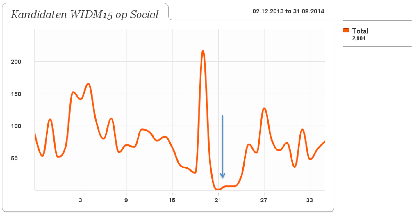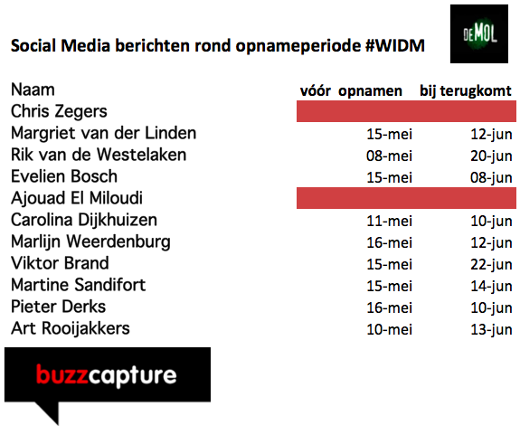 Bovenstaande grafiek toont aan dat de opnameperiode van Wie is de Mol ook dit jaar in mei en begin juni heeft plaats gevonden. Vorig jaar was goed te zien dat Maurice al snel weer aan het Twitteren was geslagen, maar deze fout lijkt voorkomen te zijn. Dit jaar lijken de deelnemers wel een socialmediatraining te hebben gehad. Maar toch lieten de deelnemers ook dit jaar online sporen achter.