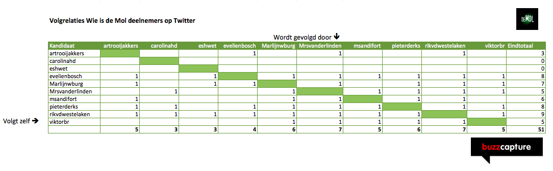 Het leek me goed presentator Art Rooijakkers ook toe te voegen aan de tabel. Chris Zegers Twittert al vanaf 2012 niet meer en is daarom uit het overzicht gelaten. Sinds april 2014 Twittert @EshWet (Ajouad El Miloudi) niet meer en wordt wellicht daarom door slechts 3 andere kandidaten gevolgd. Carolina Dijkhuizen had een lange Twitterstilte ingelast en is pas sinds november 2014 weer terug op Twitter. Dit kan verklaren waarom ook zij door slechts 3 andere wordt gevolgd. Opvallend is dat Rik van de Westelaken de enige deelnemer is die alle andere deelnemers zelf volgt.