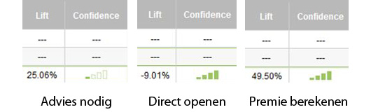 De testopzet zelf was een simpele A/B-test, 50% van de pagina’s kreeg de teller op de productpagina en de andere helft van de pagina’s was de defaultversie zonder teller. De succes metrics bestonden onder andere uit de click-through rate op de buttons ‘Advies nodig’, ‘Premie Berekenen’ en ‘Direct Openen’. Dit slaat op de teksten op de call-to-action-buttons en achterliggende systemen.