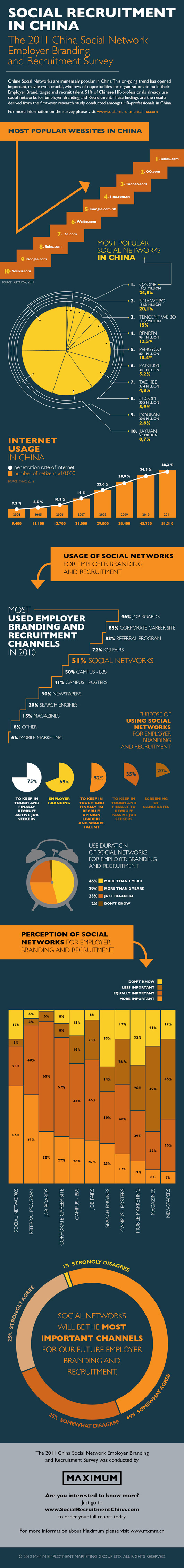 De resultaten uit het onderzoek geven een uniek inzicht in de status van de markt wat betreft social recruitment in China. Zo blijkt dat, net als in andere delen van de wereld, grote online sociale-netwerksites als Qzone, Renren en Sina Weibo veel mogelijkheden bieden voor organisaties om met hun doelgroepen in contact te komen. Uit het onderzoek blijkt dan ook dat 51% van de respondenten deze sites gebruikt binnen hun organisatie voor recruitment-doeleinden. Daarnaast worden Renren (sociaal netwerk, vergelijkbaar met Facebook) en Sina Weibo (microblog, vergelijkbaar met Twitter) aangegeven als de meest gebruikte kanalen op dit moment.