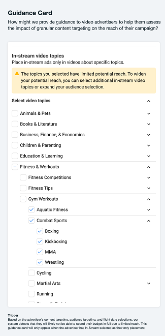 Op basis van machine learning heeft Facebook meer dan twintig onderwerpen geselecteerd, waaronder bijvoorbeeld sport. Elk van de onderwerpen is vervolgens verder uit te splitsen in subonderwerpen, zoals boxen, fitness, zwemmen en fietsen. In totaal maakt Facebook meer dan 700 verschillende subonderwerpen beschikbaar. Adverteerders zullen beter in staat zijn om hun video rond een specifieke interesse te plaatsen en dit zal uiteindelijk helpen om de impact van videoadvertentie-ervaringen te maximaliseren. Naar verwachting wordt de nieuwe targeting-mogelijkheid later dit jaar wereldwijd beschikbaar gemaakt voor alle adverteerders.