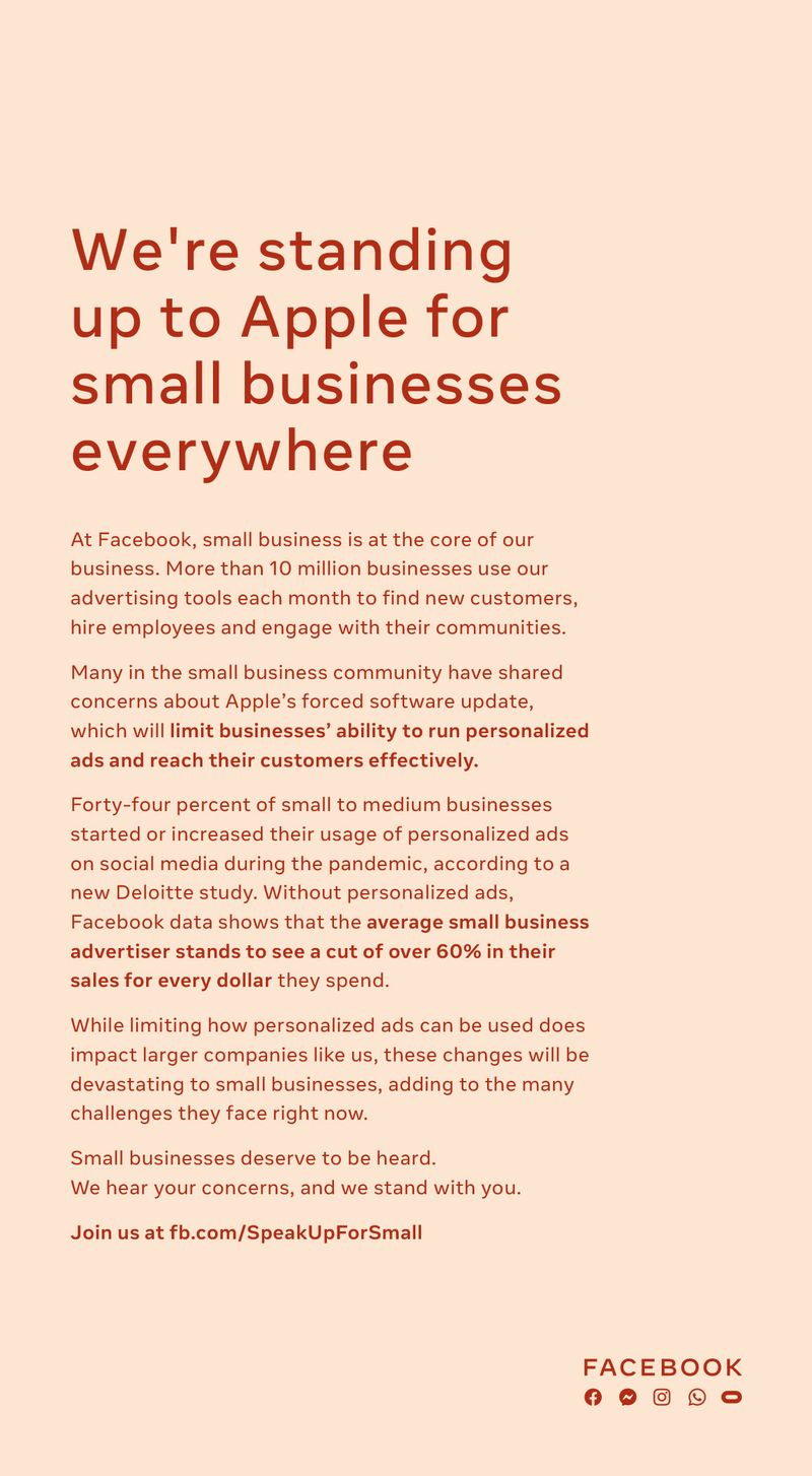 Met de nieuwe Anti-Apple-campagne probeert Facebook zichzelf neer te zetten als een voorvechter voor alle MKB-bedrijven wereldwijd. Tegelijkertijd heeft Facebook de afgelopen jaren het organisch bereik van bedrijven afgeknepen en ze nagenoeg gedwongen om advertenties in te zetten om hun doelgroep te bereiken. Het lijkt daarom vooral om een groot charmeoffensief te gaan. Hoewel de algemene boodschap van Facebook niet onjuist is, zullen vooral grote bedrijven met de capaciteit om optimaal gebruik te maken van datatracking en -analyse de grootste impact kunnen verwachten. Deze bedrijven zijn immers meer afhankelijk van gedetailleerde advertentie-targetingmogelijkheden. Apple heeft gereageerd op de kritiek van Facebook en kwam met onderstaande verklaring: