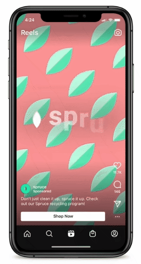 Zoals in het voorbeeld hieronder is te zien, zijn Reels-advertenties verticaal en nemen zij het volledige beeldscherm van de gebruiker in beslag. Ze mogen maximaal 30 seconden duren en worden weergegeven tussen afzonderlijke organische Reels. Gebruikers krijgen de mogelijkheid om advertenties op te slaan, te delen, opmerkingen toe te voegen of te liken.