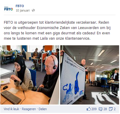 “We hebben er heel bewust voor gekozen geen primaire commerciële doelstellingen te hangen aan onze socialmedia-inzet. Het primaire doel is de dialoog met onze klanten voeren. Te luisteren en hen ‘onder te dompelen’ in wie we zijn als FBTO. We bouwen aan een langetermijnrelatie met klanten en prospects. Dit doen we door een consistente en betrouwbare identiteit uit te dragen. Natuurlijk verlenen we ook service aan onze klanten via de social kanalen. De klant bepaalt via welk kanaal hij bediend wil worden.”