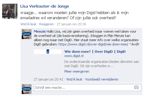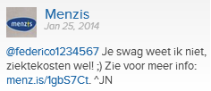 Een van de merken die het percentage negatieve sentiment afgelopen jaar aanzienlijk wist terug te brengen was Menzis. Ik vroeg Antina van der Veen, teammanager social bij Menzis, over de inzet van webcare. “Voor ons is het heel belangrijk dat vragen die via social media worden gesteld, ook daar worden beantwoord. Zoveel mogelijk openbaar, maar waar het persoonlijk wordt via privéberichten. Wij zullen nooit verwijzen naar het telefoonnummer van onze klantenservice of mensen vragen hun klacht maar op de mail te zetten (dit gebeurt alleen als iemand ons bijvoorbeeld een bestand wil sturen). Mocht er een telefoongesprek nodig zijn, dan bellen wij met de klant. Niet andersom.”