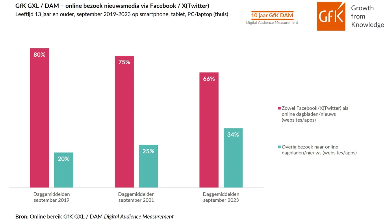 Het online doorverwijzen vanuit sociale media (Facebook/Twitter-X) naar online nieuwsartikelen vindt steeds minder plaats. Dat becijfert GfK GXL in zijn Digital Audience Measurement. De daling van het doorverwijzen vanuit sociale media naar online nieuwsmedia vindt onder alle leeftijdsgroepen plaats, hoewel deze onder jongeren het sterkst is. Opvallend genoeg neemt het aantal bezoekers aan online nieuwsmedia wel toe.